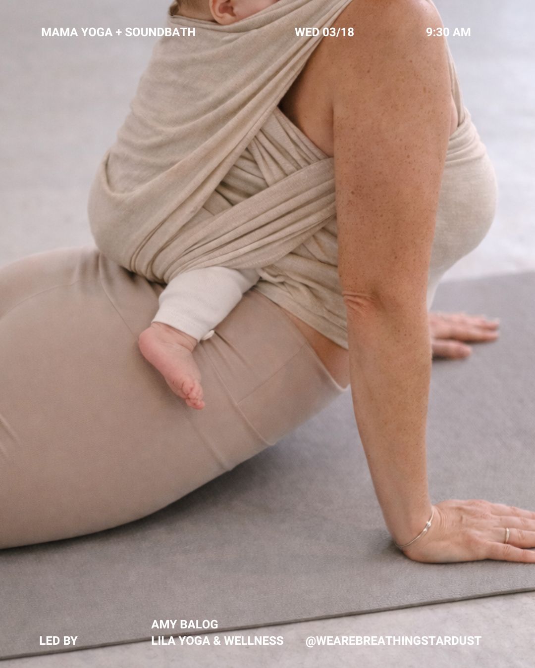 All babies must remain secured in carrier throughout the practice. This allows for a smooth, connected flow and ensures a grounded, supported environment for all participants.