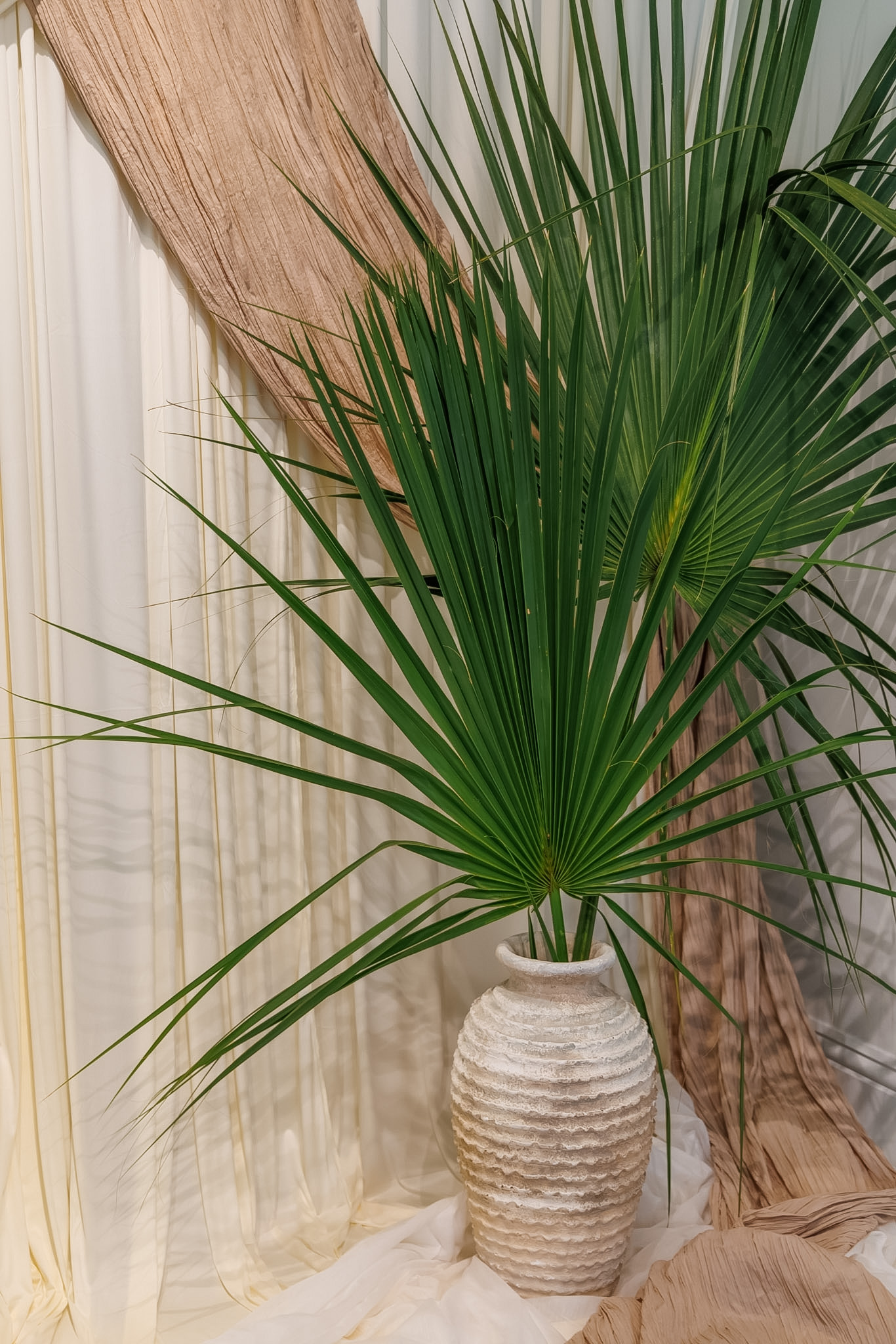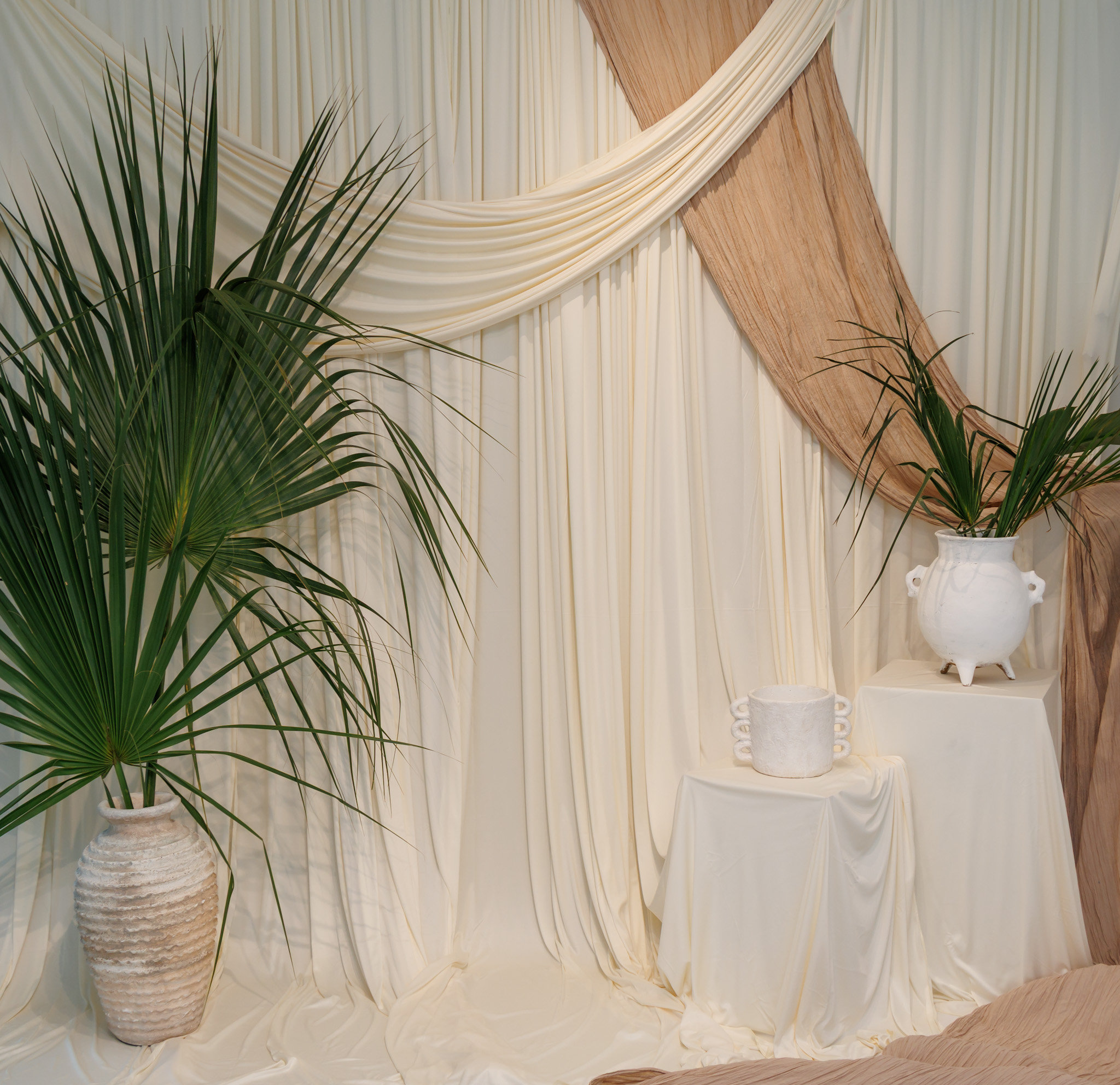 - Main Set: Soft draped backdrop with natural textures and neutral tones