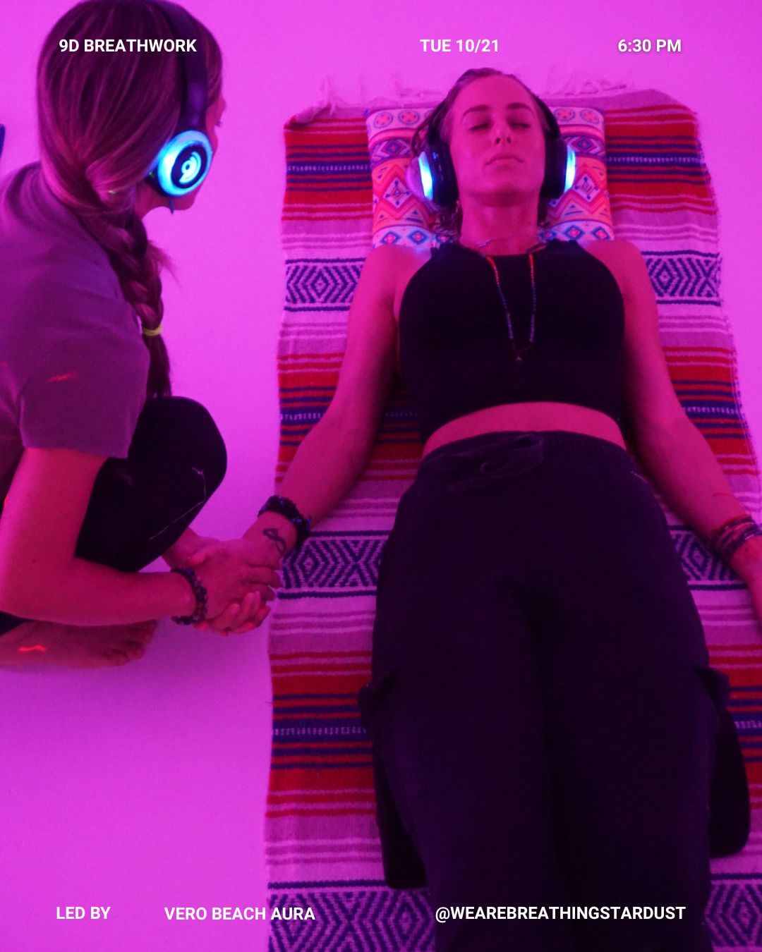 9D Breathwork is an approach to wellness and healing enriched with a multi-dimensional sound experience. It incorporates a blend of binaural brain entrainment, isochronic brainwave tones, solfeggio frequencies, 432Hz harmonic tuning, somatic Breathwork, subliminal hypnotic therapy, guided coaching, and bioacoustic sound effects.